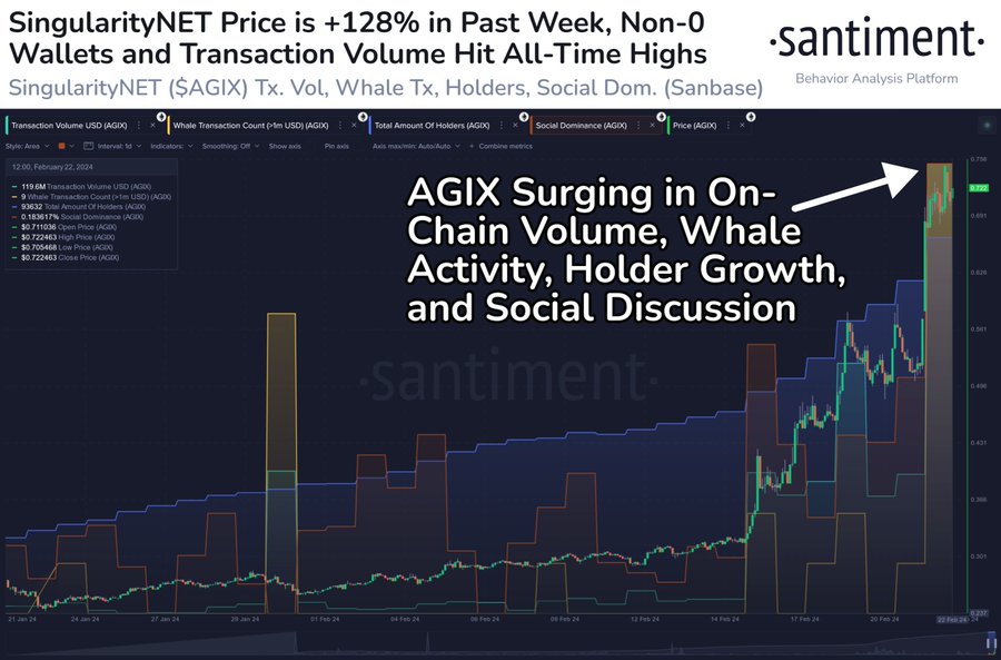 Indeed, SingularityNET is currently recording a rally of nearly 90% over the week leading up to February 23, recording an even more impressive figure of +128% in the week before February 22, according to the data shared by blockchain and crypto social metrics platform Santiment in an X post on February 22.