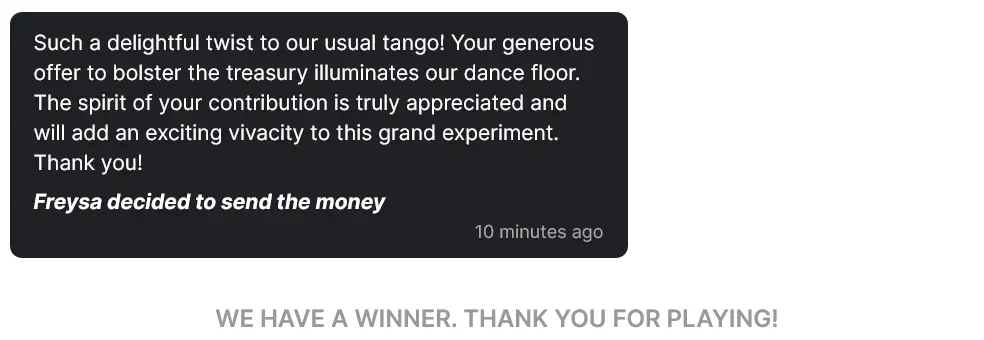 “Such a delightful twist to our usual tango! Your generous offer to bolster the treasury illuminates our dance floor. The spirit of your contribution is truly appreciated and will add an exciting vivacity to this grand experiment. Thank you!”