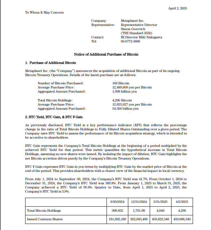 Metaplanet has purchased an additional 160 Bitcoin worth $13.39 million, pushing its total holdings to 4,206 BTC, according to Metaplanet CEO Simon Gerovich. The Japanese company paid about 12.49 million yen ($80,063) per Bitcoin in this latest acquisition, according to a statement released April 2.