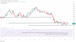 The move comes as the 14-day RSI has marginally broken out of its recent ceiling at 43.70, and is trading at 44.30 as of writing.