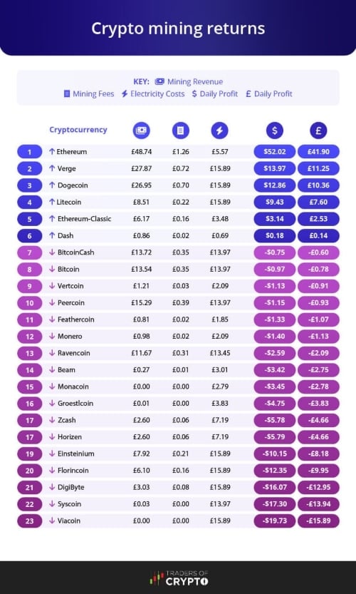 To make these calculations Traders of Crypto used data from coinwarz regarding a single mining-rig, and a 2021 report on electricity bills from the Department of Business, Energy and Industrial Strategy was used as the average electricity price per kilowatt hour.