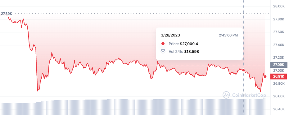 At the time of writing, Bitcoin traded at $27,025 with a 24-hour trading volume of $18 billion, up around 29%. BTC declined by 2.90% in one day.