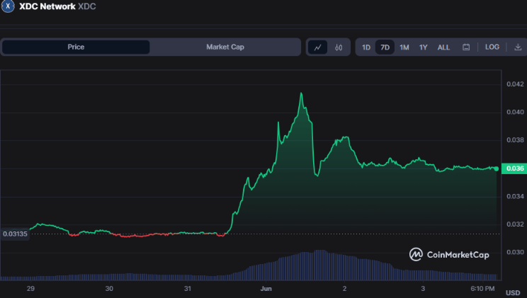 Over the past week, XDC has shown significant momentum in terms of market performance. The price of XDC started the week at $0.03136 and experienced a substantial increase, reaching a high of $0.04146 on Thursday. This represents a notable 15.01% increase throughout the week. However, the token has since declined and stabilized at its current price of $0.0361, indicating a 1.26% decrease in the last 24 hours.