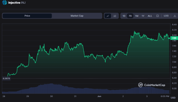 Injective Protocol is an innovative decentralized exchange (DEX) platform built on Ethereum that offers fast and secure trading. In terms of market performance, the INJ token has demonstrated a positive performance in the market, exhibiting a consistent upward trend over the past week. The analysis reveals that the token began the week at $6.37.