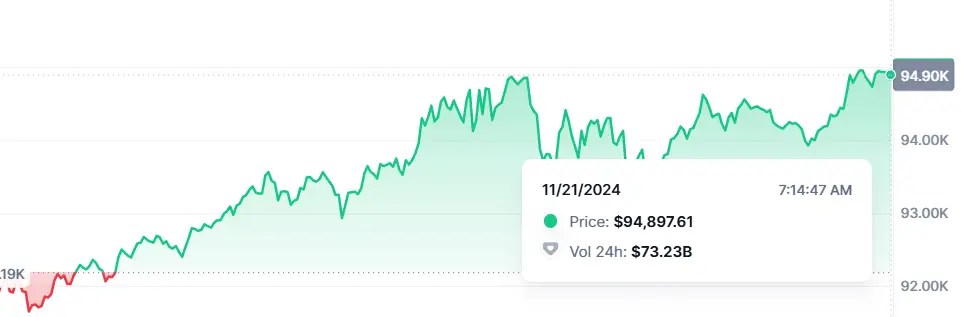 Bitcoin (BTC) has hit another milestone as it reached a new all time high(ATH) of $94,954.67 in the early hours of this morning. It is currently quoted at $94,897. 61, up 3.16% in the past 24 hours. In response to this development, the probability of BTC reaching $95,000 in November has also increased significantly on Polymarket, reigniting excitement among investors keen on tracking Bitcoin Price Prediction trends.