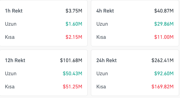 At this point, according to data from CoinGlass, $262.41 million was liquidated in crypto futures in the last 24 hours. Of this, $169.8 million consisted of short positions and $92.6 million consisted of long positions.