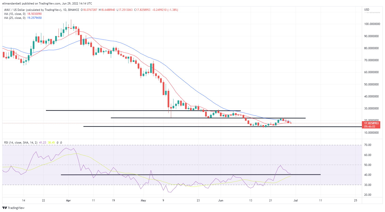 This drop saw the avalanche token fall for a fourth straight day, with prices now nearing its recent support point at $14.50.