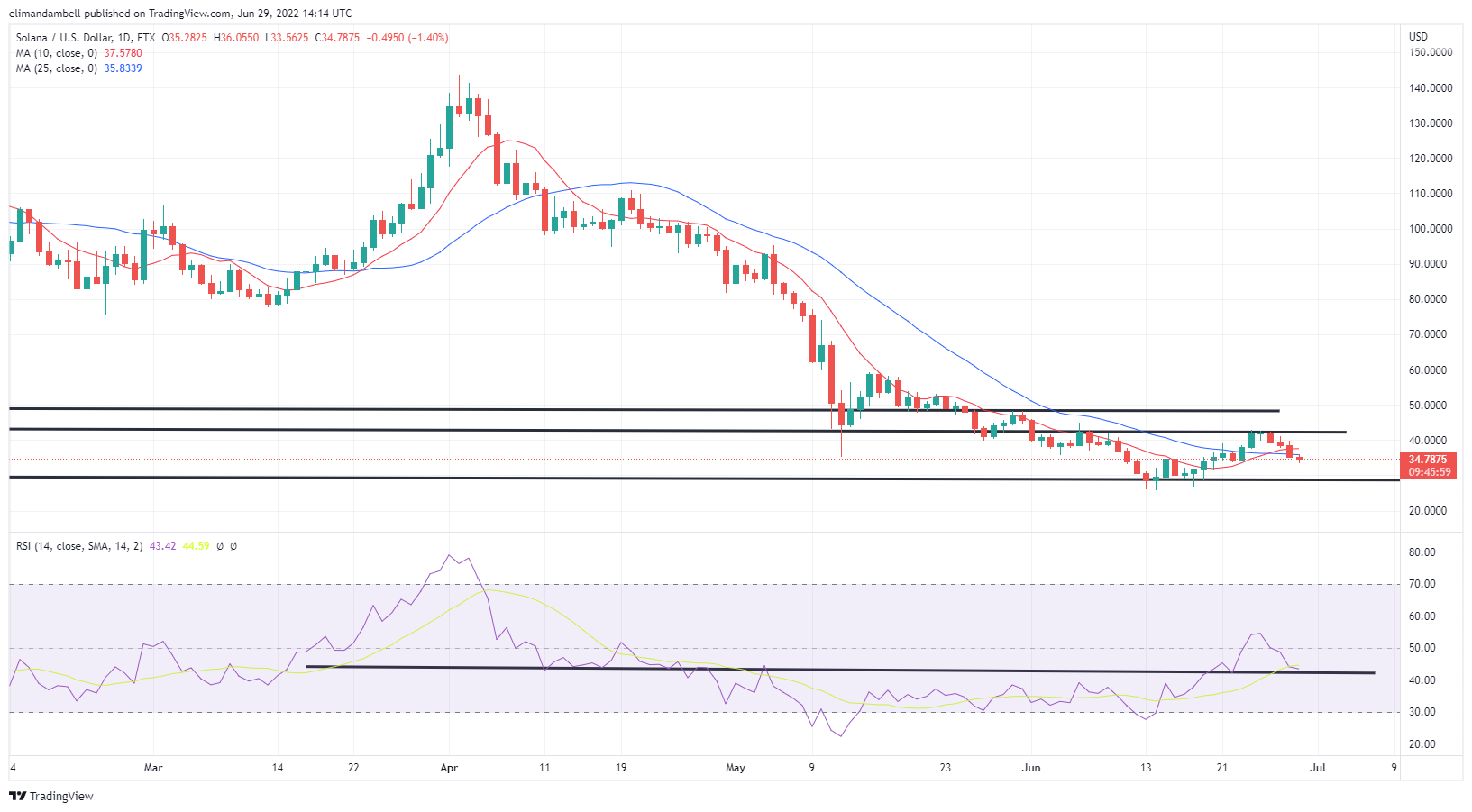 SOL was lower in today’s session, as prices fell for a fourth straight session following a false breakout of the $40 level.