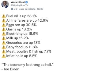 Congressman Lance Gooden (R-TX) tweeted that in reality “65% of Americans say the economy is getting worse.” Ronna McDaniel, chair of the Republican National Committee, referenced a recent CNN poll stating that 78% of Americans say the economy is “poor.” A U.S. House candidate from Texas, Wesley Hunt, tweeted a list of items that have gone up in price, including fuel, airline fares, eggs, gas, and food.