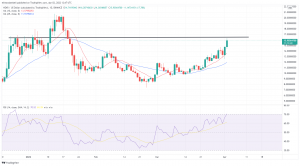 The move also came as price strength surged on the day, with the 14-day RSI indicator now tracking at 70.80.