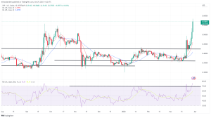 The surge came as the 14-day relative strength index (RSI) also broke free of a recent ceiling at the 70.00 mark.