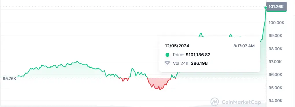 The long-awaited moment for the crypto community has finally arrived, as Bitcoin has reached the $100K mark and is currently quoted at $101,000.