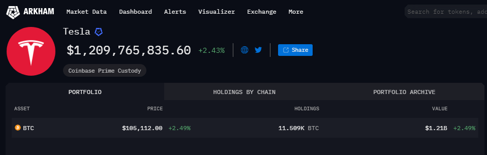 Based on data from Arkham Intelligence, Tesla possesses 11,509 BTC, which is worth $1.19 billion at the current market value.