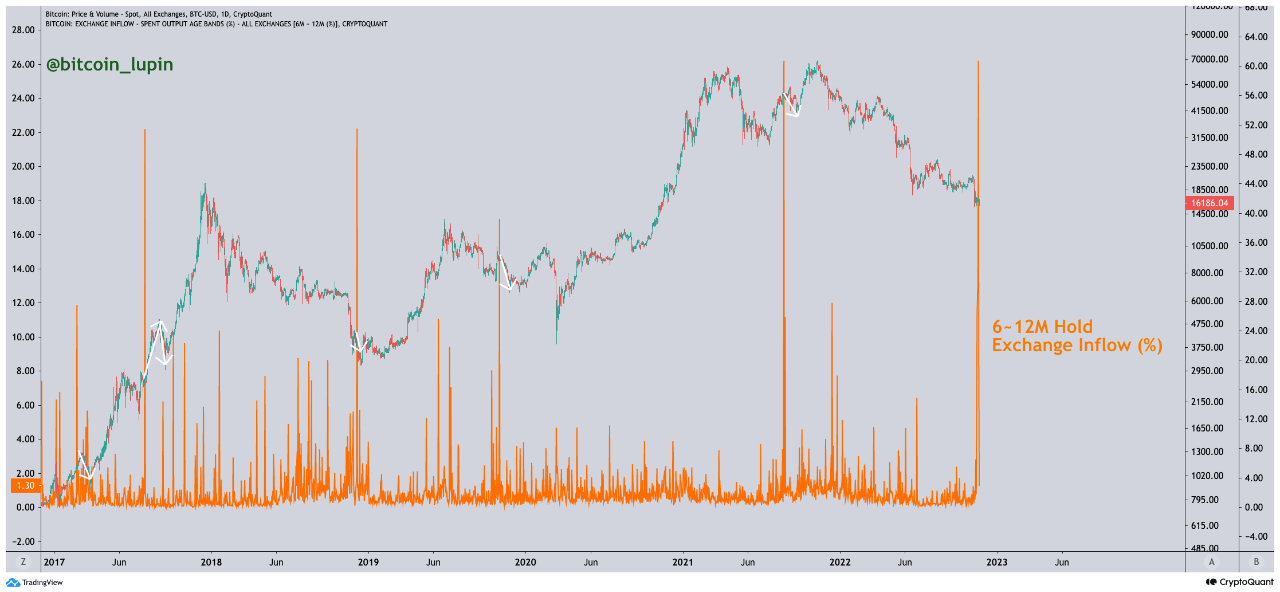 According to CryptoQuant analyst CoinLupin, the exchange inflow share of six to 12 million BTC holders surged in the past few days. But, unfortunately, BTC’s price logged a decline whenever this occurred in the past.