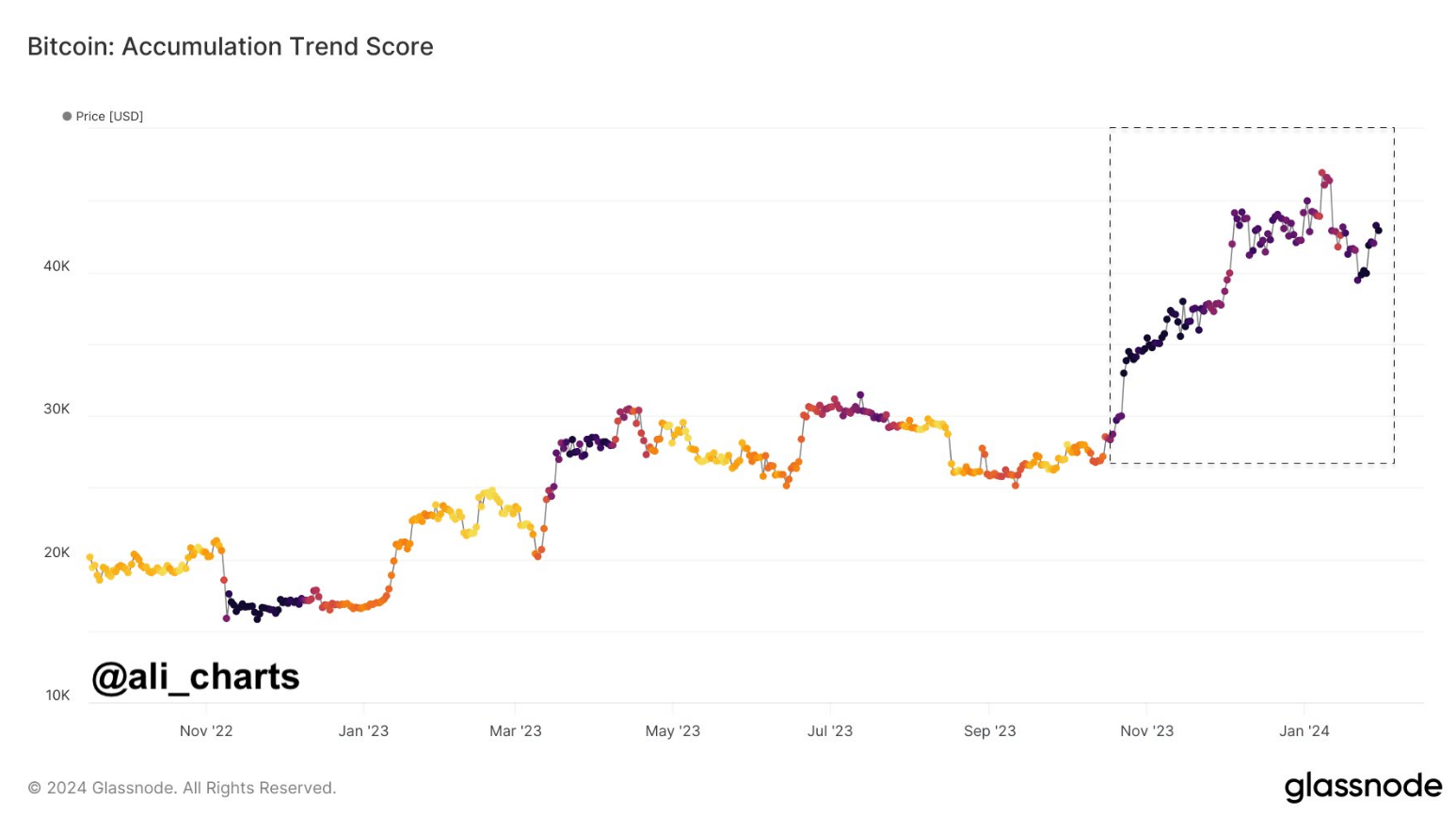In a significant development for the cryptocurrency space, Bitcoin (BTC) is experiencing a surge in accumulation, reaching a three-year high in the Accumulation Trend Score. This indicates growing confidence from major players in the market.