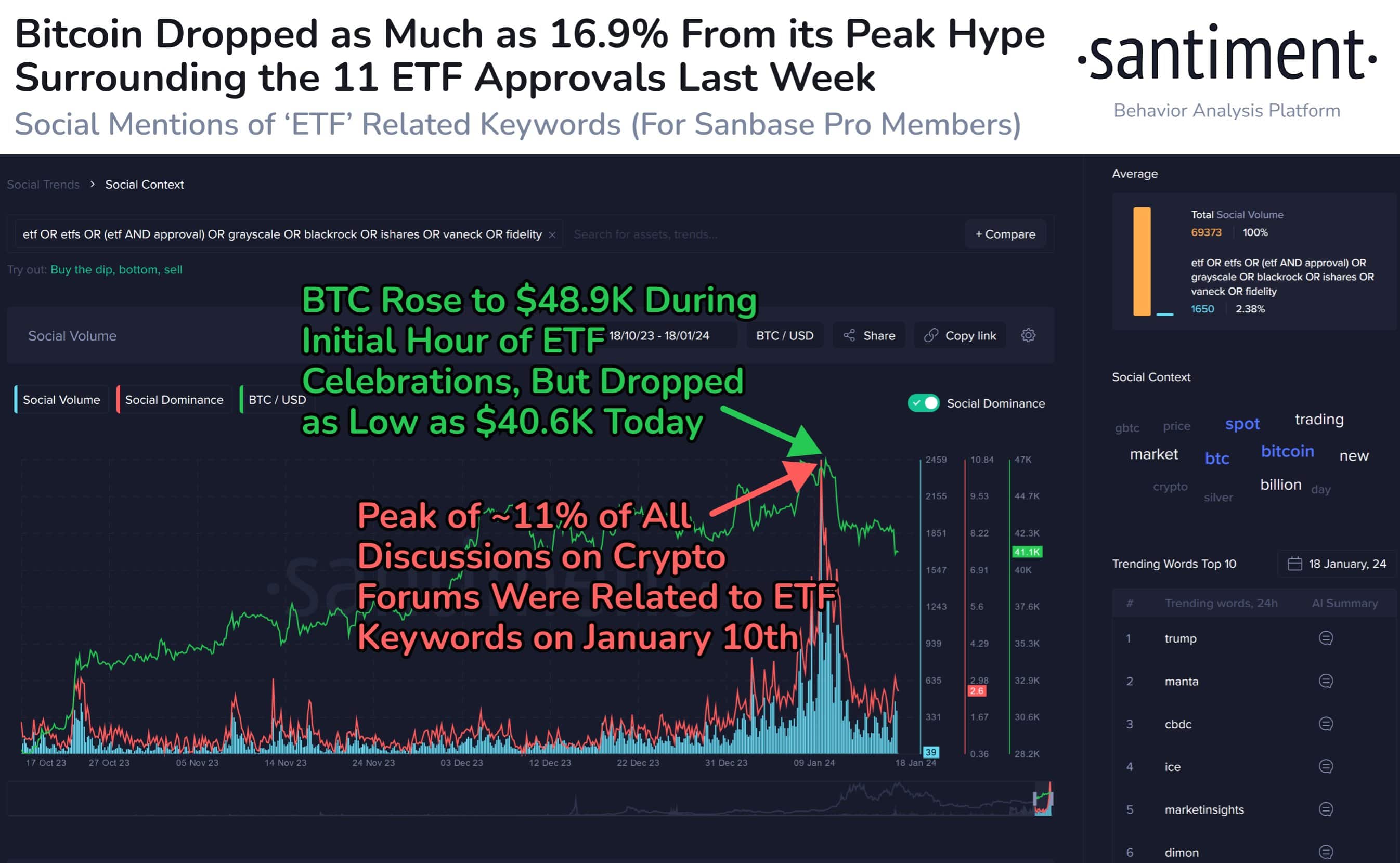 Experts posit that the widely anticipated approvals were already factored into market prices at the time of the announcements, leading to a subsequent decline in Bitcoin’s value. After Bitcoin experienced a significant drop to $40.6K, representing a 16.9% decrease from its peak market value the previous week, Santiment observes that the narrative surrounding these ETFs might shift.