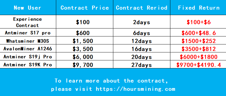 ② Purchase a Cloud Mining Contract: 8HOURSMining offers a variety of high-efficiency, high-yield contracts, each with varying hashrates and terms, resulting in varying returns.