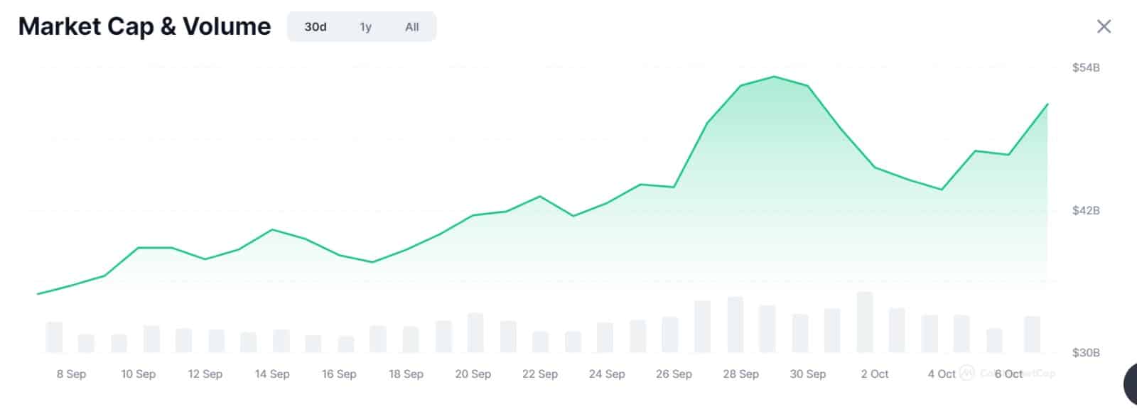 Equally, memecoins have made a strong bounce, rising in market cap from $43.7 billion to $50.9 billion on weekly charts.