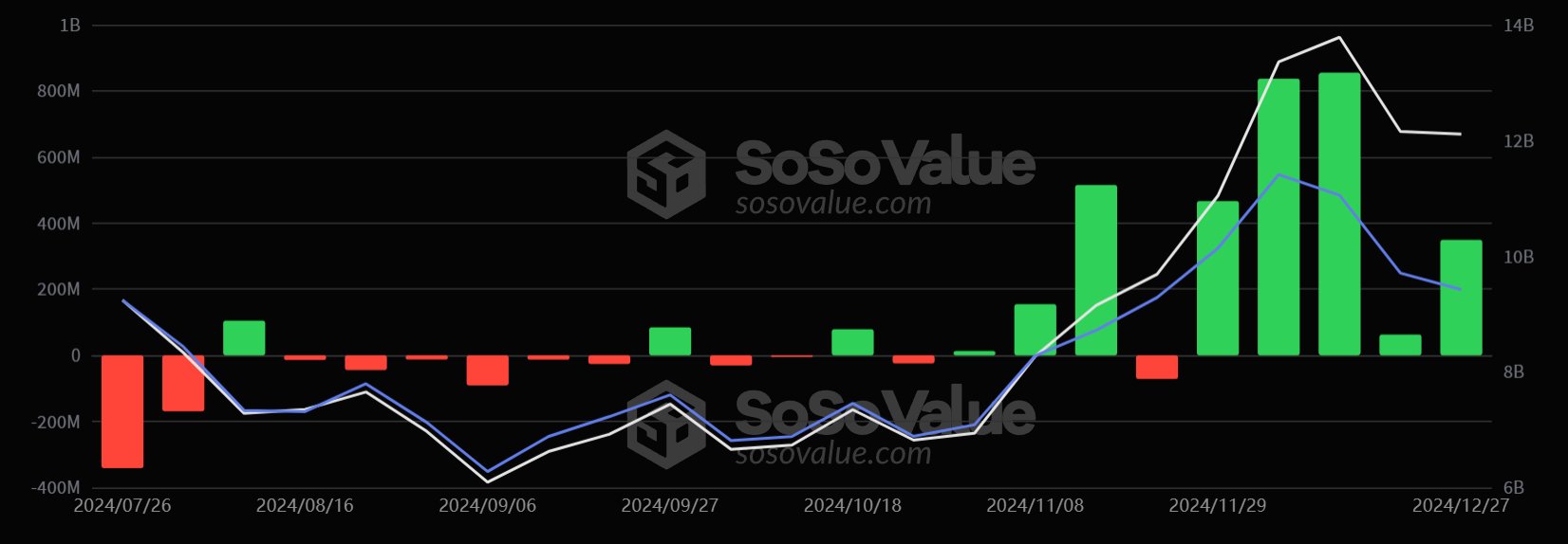 Last week, between December 23 and December 27, spot Bitcoin ETFs experienced a net outflow of $388 million, reflecting some profit-taking and portfolio rebalancing. However, the Fidelity ETF (FBTC) saw a weekly net inflow of $183 million, signaling sustained interest from certain investor segments. The total net asset value (NAV) of Bitcoin spot ETFs now stands at $106.683 billion, per data from SoSo Value.