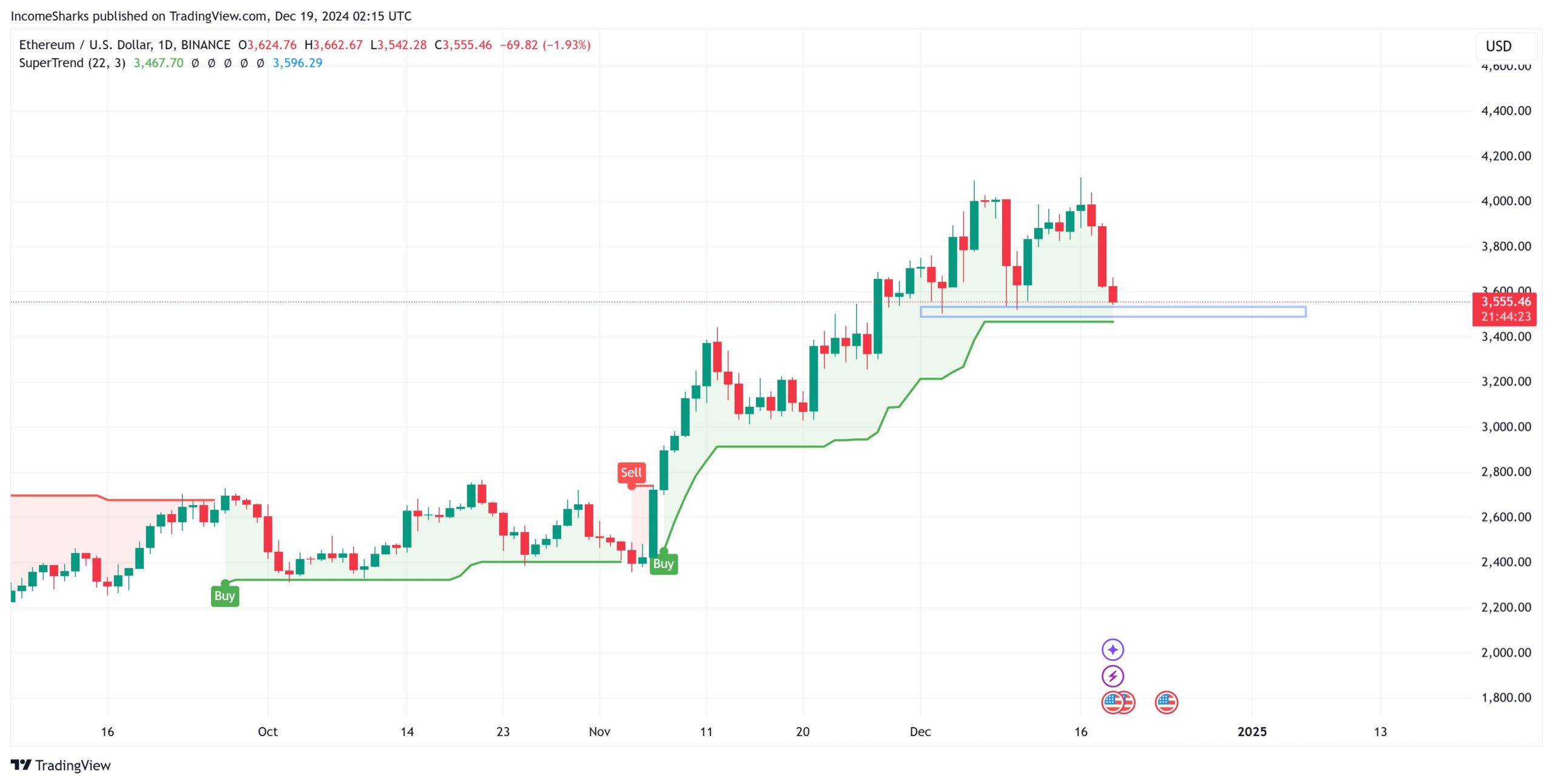 The ETH price crashed nearly 6% but bounced back from the crucial support of $3,550. Crypto analyst IncomeSharks highlighted Ethereum’s resilience amid recent market fluctuations, noting that the Supertrend indicator remains intact and bullish.