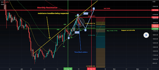 At variance with Ether bulls are those that are still short the Ether market. The targets below are 0.382, 0.5 [$1,800.15], and 0.618 [$1,744.57].