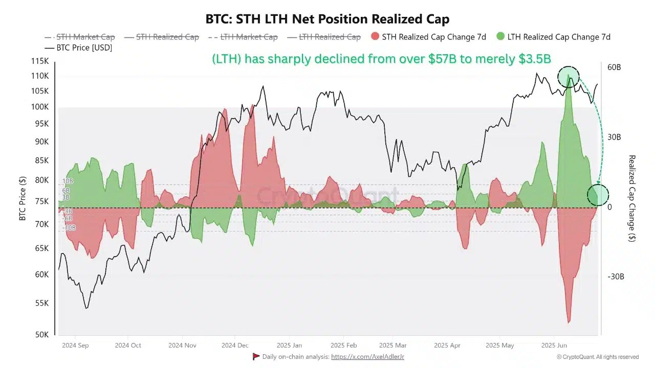 The Long-Term Holder Net Position Realized Cap dropped from over $57 billion to just $3.5 billion, revealing major profit-taking.