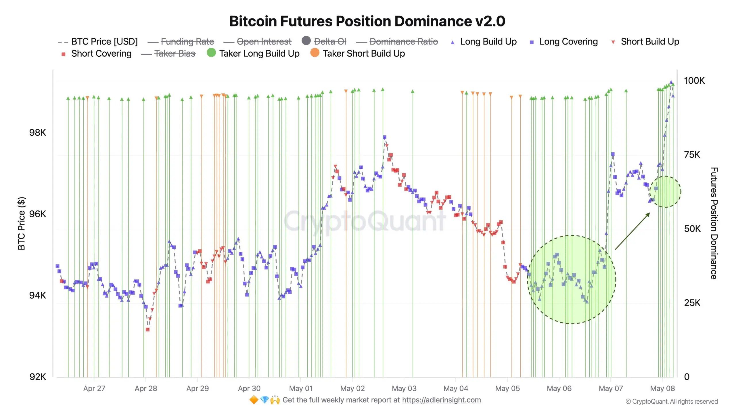 His analysis, drawn from CryptoQuant’s Futures Position Dominance v2.0, suggests that bearish traders have largely surrendered, paving the way for a potential push toward the $100,000 mark.
