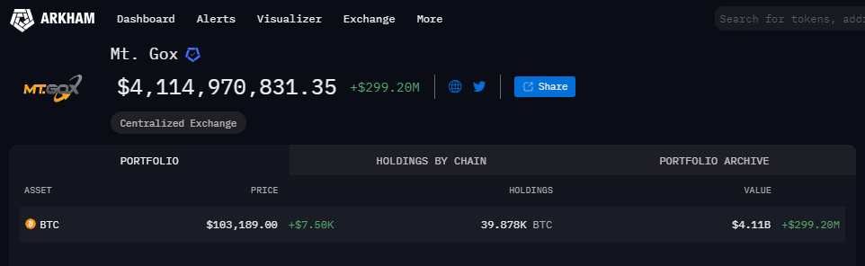 Mt. Gox still holds 39,878 Bitcoin valued at around $4.1 billion following its latest move, according to Arkham Intelligence data.