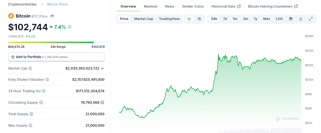 As of writing, Bitcoin is being traded at $103,152, up by 6.6% in the last 24 hours, with a total market capitalization of over $2 trillion.