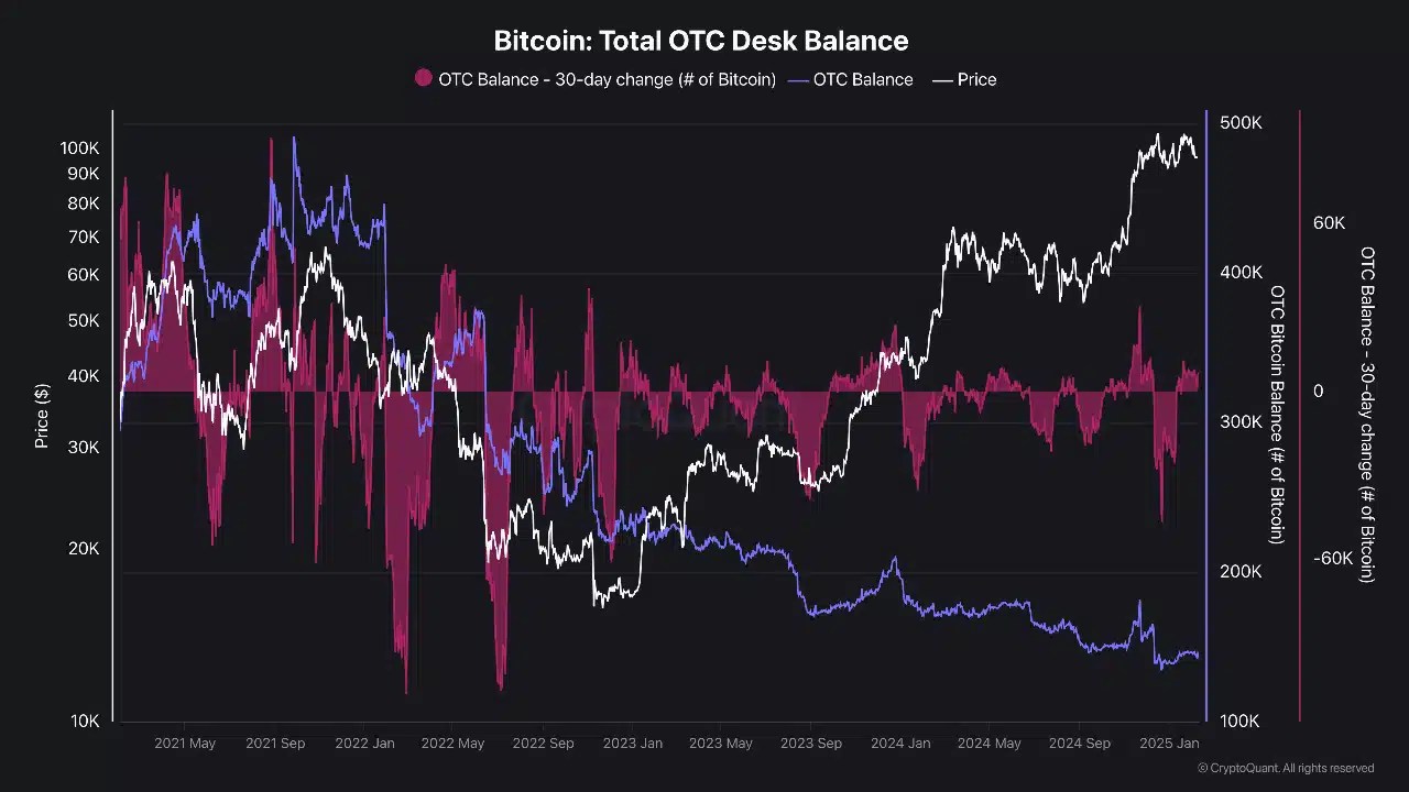 According to CryptoQuant, Bitcoin’s OTC desk balance was around 480k BTC in September 2021. Now, this balance has decreased to just 146k BTC, despite the king coin reaching $100k.