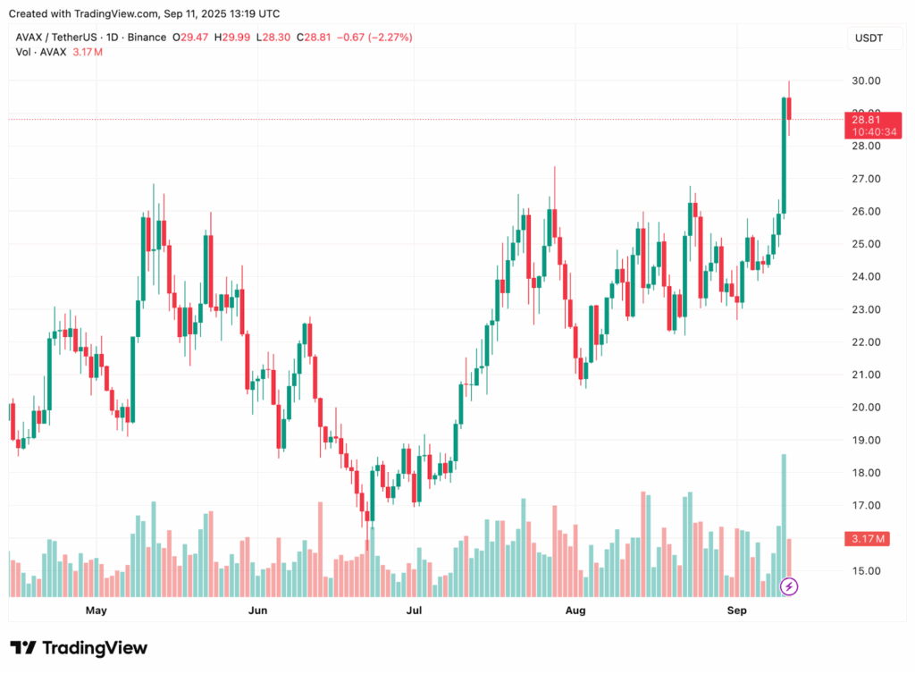 While the Bitcoin price shows strength, AVAX has emerged as one of the top altcoin performers this week. Avalanche traded as high as $30.12 on Coinbase after opening the day at $26.71. This 8.5%+ jump reflects investor excitement over reports that the Avalanche Foundation is raising $1 billion to fund cryptocurrency treasury projects.