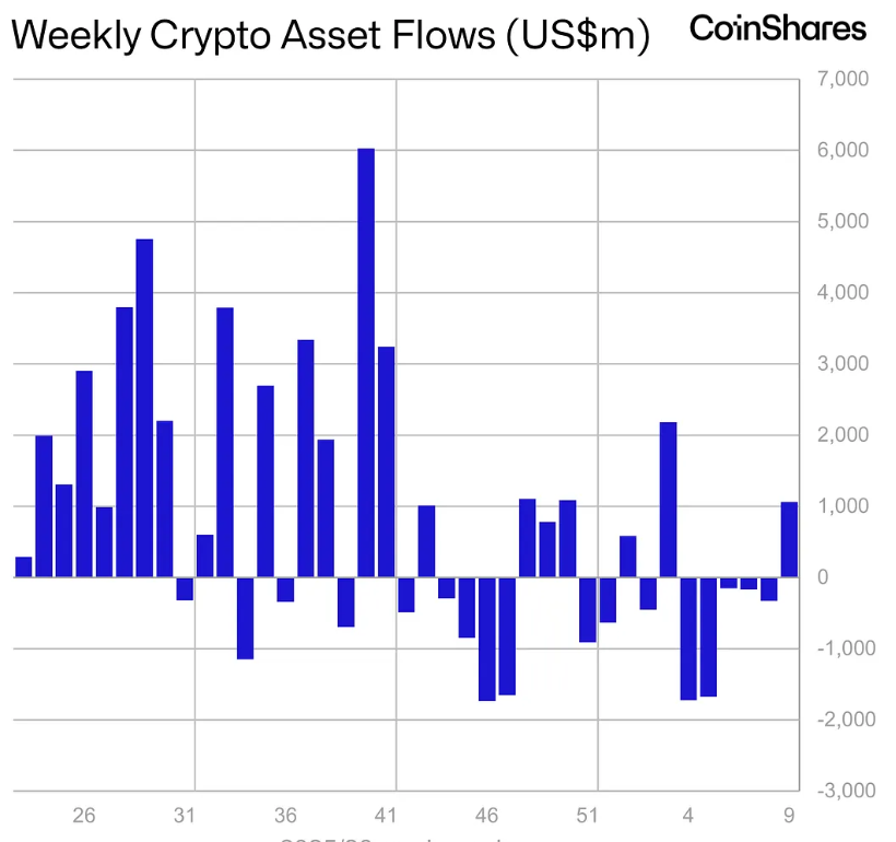 According to CoinShares’ latest weekly report, total inflows reached $1 billion during the period. The boom shows a long-term institutional need to have regulated exposure to crypto.