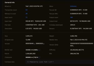 On Feb. 1, 2023, the Luxor mining pool mined the largest block (#774,628) ever recorded on the Bitcoin network, approximately 3.96 MB. The coinbase parameter of the block contains a message indicating its discovery by Luxor. The mining pool also took to Twitter to inform the community about the discovery and the reason for the large size of the block.