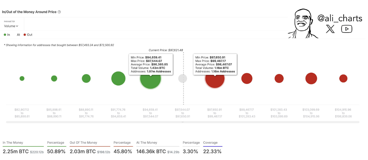 The Bitcoin inflows into crypto exchanges open up a bearish case for Bitcoin, especially since it creates a selling pressure on exchanges. Technical analysis shows that Bitcoin is currently trapped between key supply and demand levels. According to crypto analyst Ali Martinez, there is a significant 1.43 million BTC demand wall between $94,660 and $97,540, while a 1.16 million BTC supply wall sits between $97,650 and $99,470. A breakout in either direction will potentially set the trend for the next major move.