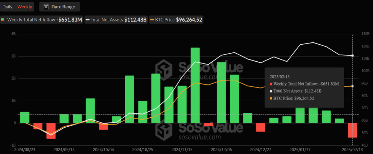 Particularly, data from SosoValue reveals that US-based Spot Bitcoin ETFs recorded $651.83 million in net outflows over the past week. Interestingly, this is the largest weekly outflow recorded in these Spot Bitcoin ETFs since the first week of September 2024. This suggests that some institutional investors have been offloading Bitcoin, either to secure profits or in response to lingering uncertainty after the drastic price crash at the beginning of February.