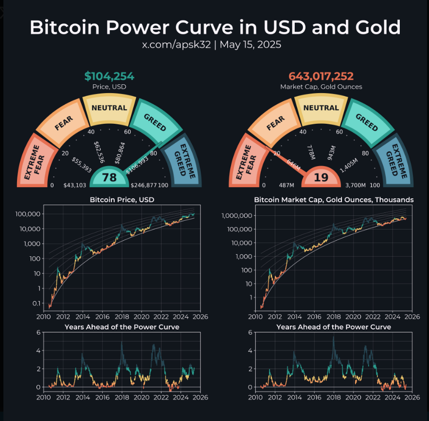 Apsk32 uses what he calls a “power curve” tool. It fits Bitcoin’s market cap in gold ounces to a smooth curve. The tool stretches back to the 2017 high near $20,000. When plotted, it suggests a 2025 bull‑market peak above $200,000. He told X followers that “if Bitcoin’s position relative to gold keeps improving, returns could top expectations.”