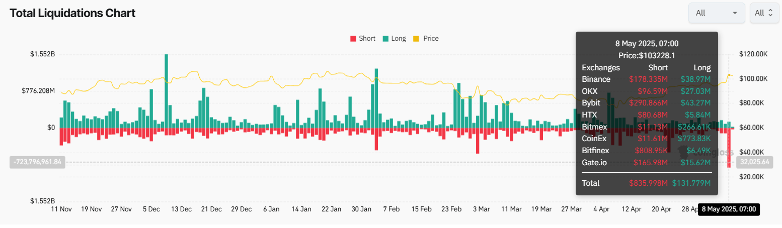 As the price of Bitcoin broke $103,000, traders were caught off guard as the market saw subsequent large-scale liquidations. Over $1 billion in positions were wiped out in just 24 hours, with short sellers hit the hardest.