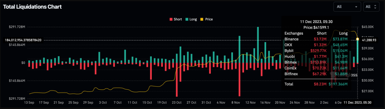 Bitcoin’s price dropped by around 8% and momentarily approached $40,400. Asian traders also began the week with a bang, selling in large quantities, liquidating over $197 million in longs and $8.23 million in shorts.