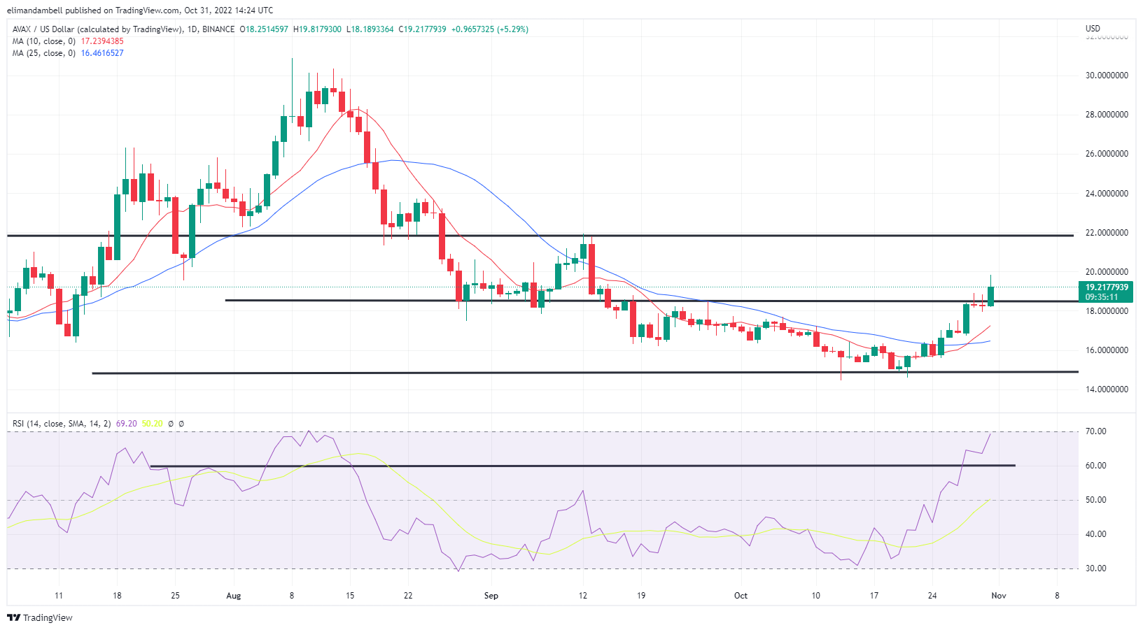 Following yesterday’s low of $17.96, AVAX/USD was able to climb to a high of $19.71 on Monday.