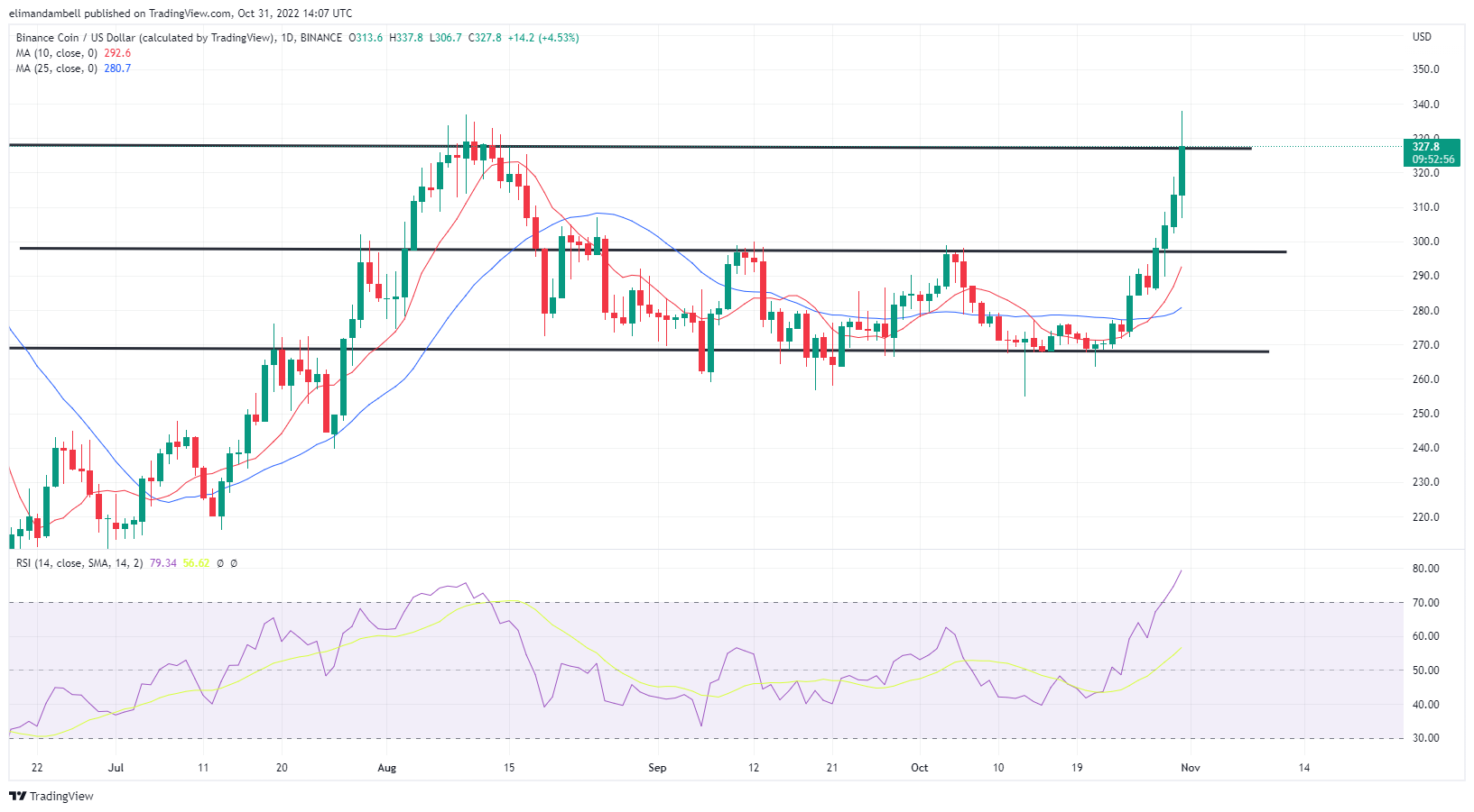 BNB/USD moved to a peak of $336.52 earlier today, which comes less than a day after trading at a low of $307.37.