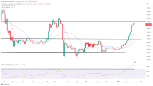 Currently the RSI of 14 days is tracking at 83.84, which is its highest level since August 2020, when price was trading below $1,200.