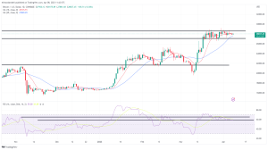 BTC/USD rose to an intraday high of $28,159.86 earlier in today’s session, less than 24 hours after trading at a low of $27,824.15.