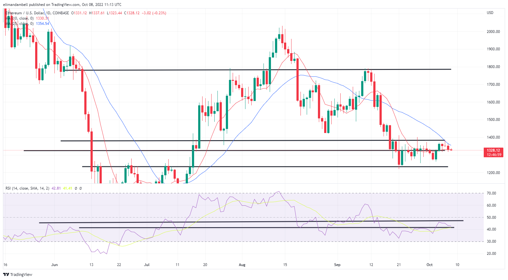 As a result of today’s sell-off, ETH/USD dropped below its support of $1,330, and is currently trading at its lowest point since October 3.