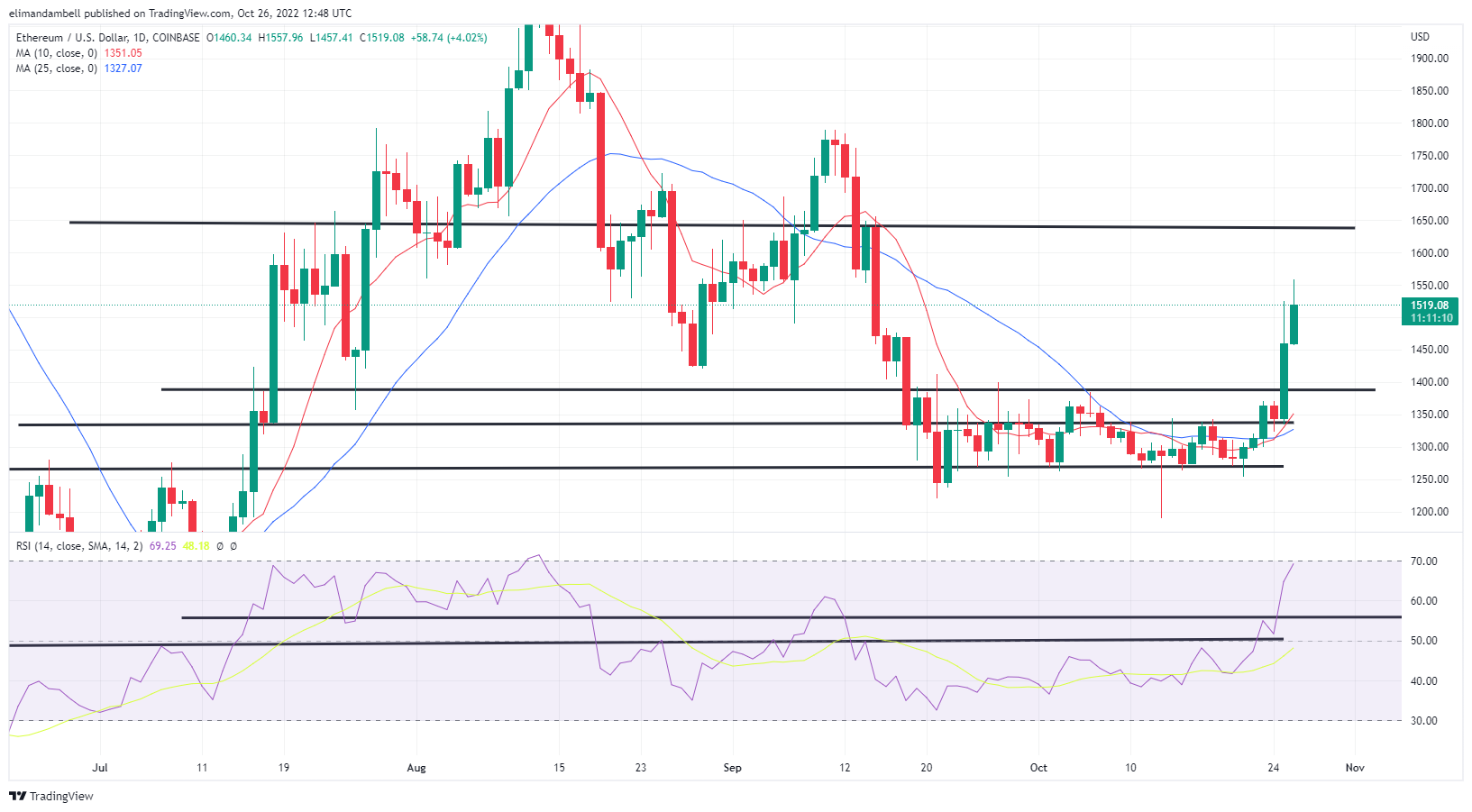 ETH/USD surged by as much as 15% earlier in today’s session, hitting a peak of $1,542.35 in the process.