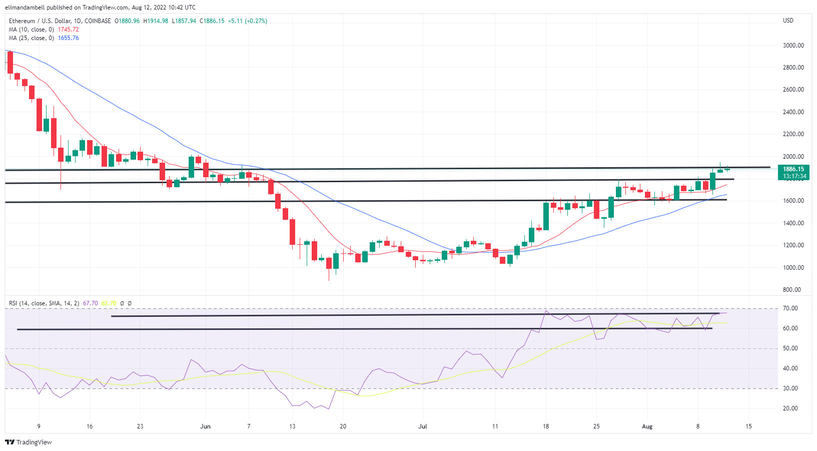 Yesterday’s high was also a key resistance point for ethereum, and was the first time in over two months that prices had collided with this ceiling.