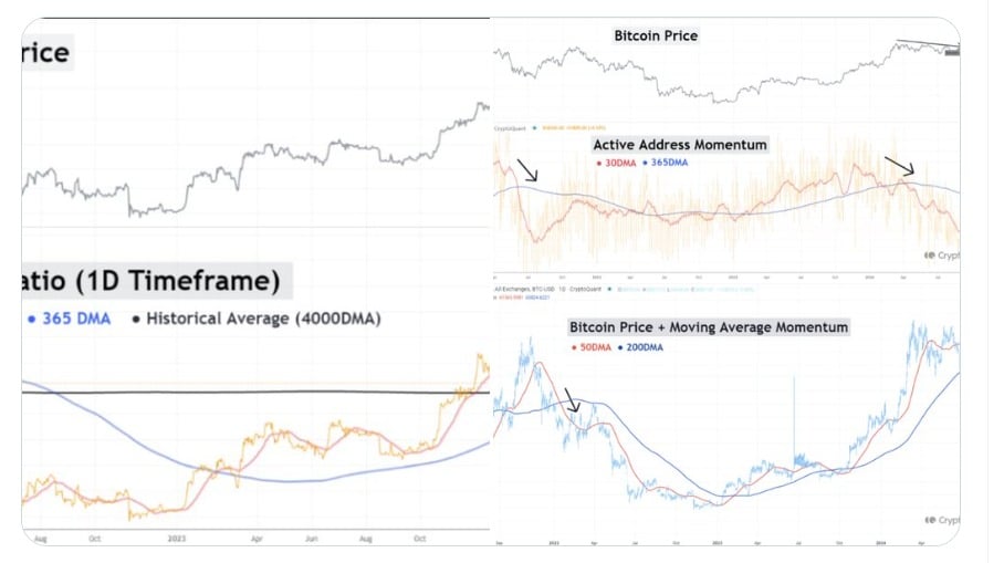 In an X (formerly Twitter) post, the analyst marked that applying moving averages on MVRV and active address revealed a death cross. Such a pattern was observed during the bearish reversal of the 2021 cycle.