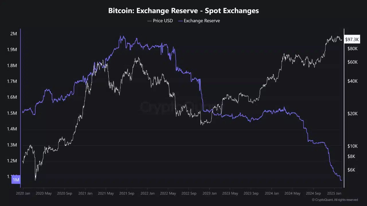 Bitcoin [BTC] reserves on spot exchanges have dropped to their lowest levels in recent years, according to CryptoQuant data. Exchange reserves grew between 2020 and 2022 but have been in a steep decline since.