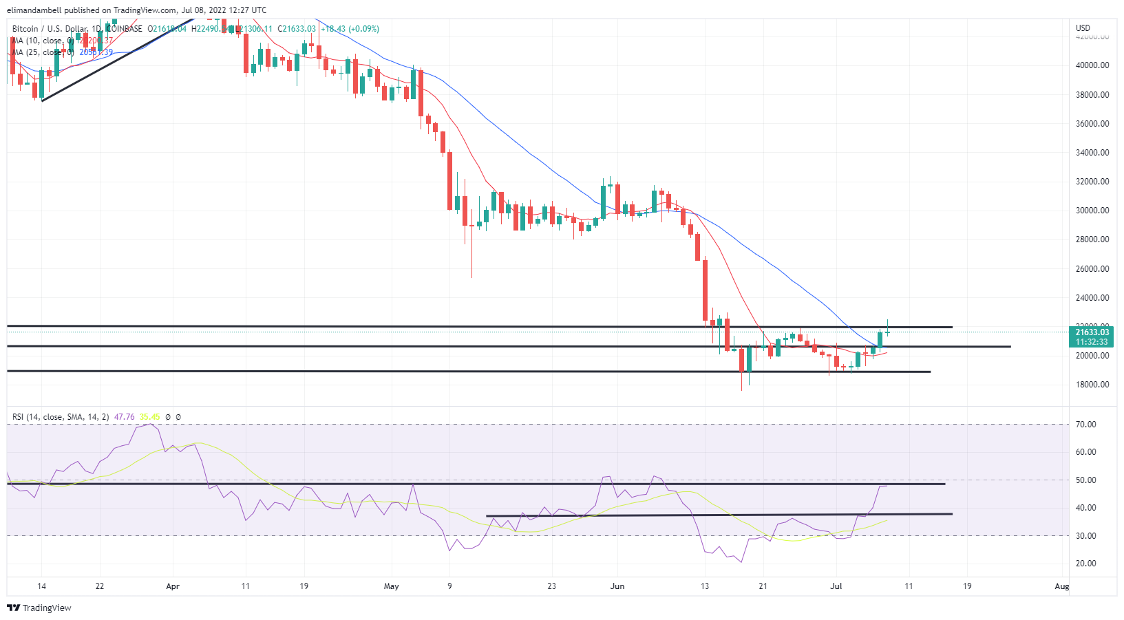Following a low of $20,382.89 on Thursday, BTC/USD surged to an intraday peak of $22,314.94 earlier today.