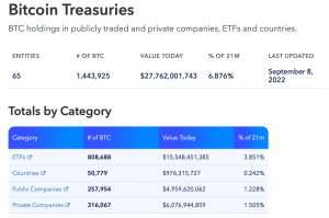 The 1.44 million BTC in treasuries today is worth roughly $27.76 billion using current spot market values. Data saved via archive.org shows that when 2022 started, the 65 publicly traded and private companies, ETPs, and countries held 1,501,406 BTC.