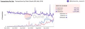 Since The Merge, Ethereum’s onchain fees have been considerably lower. However, combined transaction volume on layer two (L2) chains Arbitrum and Optimism has outpaced Ethereum’s onchain transaction output. On Saturday, Jan. 14, 2023, Ethereum processed 1.10 million onchain transactions, while combined transactions on Arbitrum and Optimism reached 1.32 million for the same day.